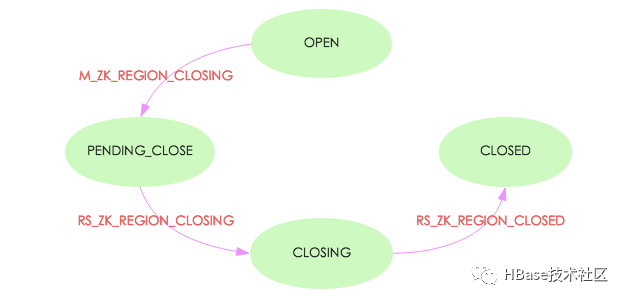 完成之后生成事件RS_ZK_REGION_CLOSED,更新到Zookeeper,Master监听到ZK节点变动之后更新regionStates,将该Region的状态改为CLOSED;
