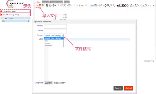 只能识别Newick、Nexus、PhyloXML、Text和Jplace等格式的纯文本文件(plain text files),比如MEGA等软件输出的Newick文件或者以.tre为后缀的文件。