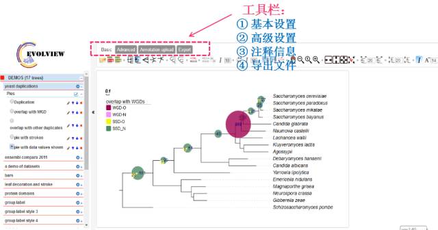 Evolview可在线进行系统进化分析,简约而不简单。能够标注较复杂的注释信息,可导出多种格式的文件,包括pdf、svg、tiff、png,而且绘制完成的进化树可永久性的保存在网站里,也可进行共享。心动了吧,那快猛戳这里,http://www.evolgenius.info/evolview