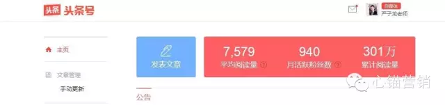 双雄会严子龙,就是坚持在今日头条写文章。目前其文章阅读量已经301万,多么恐怖的数字!如果你要给301万人打一次电话,你这辈子也打不完!而严子龙就是通过不到一年时间做到了!