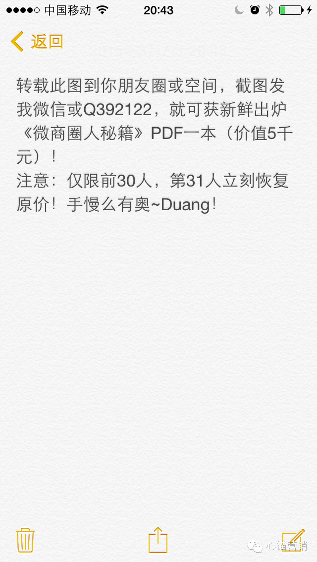 我经常在课堂上做营销测试,以下是我让学员在课堂上做的现场实操,有时候我就直接放我的微信与Q号,结果3天内,我的微信与Q都响个不停,不断有人问我要电子书!