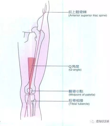 膝关节的Q角被定义为股四头肌(主要是股直肌)和髌骨肌腱之间的夹角,为股骨与髌骨的位置关系提供有用的信息。要测量Q角,需要一个长臂测角仪,将测角器的中心置于髌骨的中央,将下臂与髌腱和胫骨粗隆成一条直线,将上臂置于髂前下棘处(直肌的位置),测角器的小角度就是Q角。