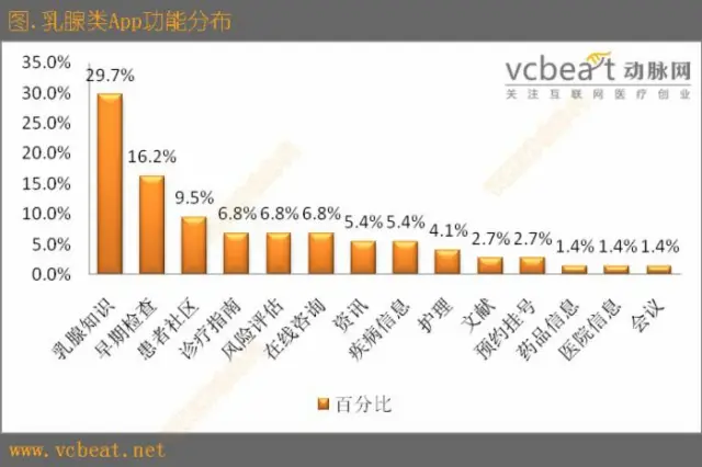 根据以上分类,研究院做了细分项梳理,乳腺类App细分功能主要分布在14个类别。其中TOP3的有乳腺癌知识、早期检查、患者社区,接着比例持平的是医学信息里的诊疗指南、资讯以及在线咨询、风险评估等。与前期统计的其他单病领域类App相比,功能分布点几乎相同,这也说明了现阶段医疗类App同质化现象严重,缺少个性化和定制化的内容要求。