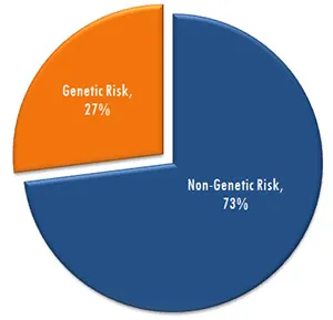 近年来的研究已经发现:乳腺癌和大多数恶性肿瘤一样,大多数(90-95%)都是由多种基因和环境共同作用引起,其中大约27%由基因引起,73%由于生活方式和环境刺激导致。