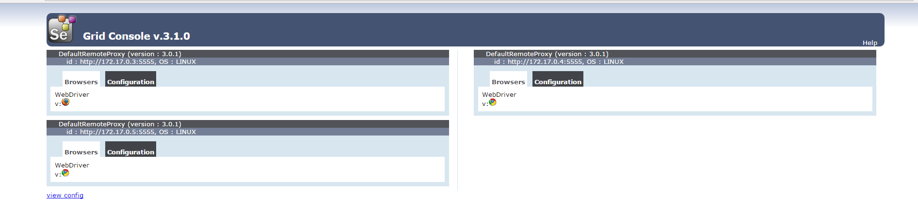 启动完整之后打开selenium gird,就能看到具体浏览器容器的启动情况,当然,这一步也是要做到自动检查是否启动成功的