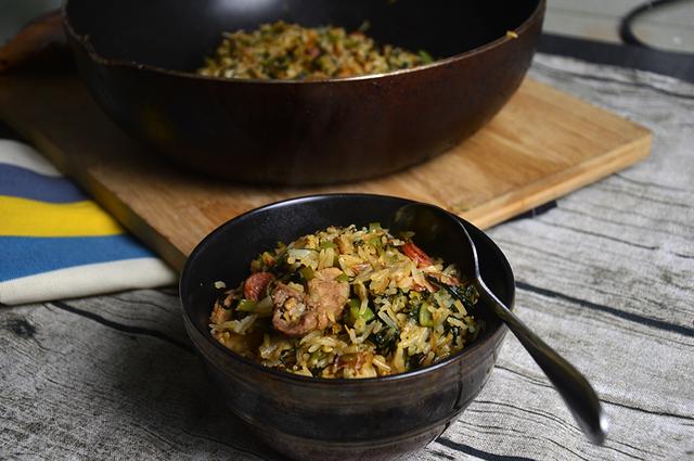 这碗炒饭对我来说太熟悉不过了,但是但凡正宗的口味没有本地原料的支撑,就得靠yy来补充了。我们的炒饭是要用油麦菜来包裹着吃的,叫菜包饭。这种类似于印度手抓饭的特色在我们地方是一道亮丽的风景线。我怀念,每年回家都得饱食一餐,但远远觉得不够。