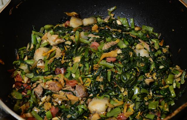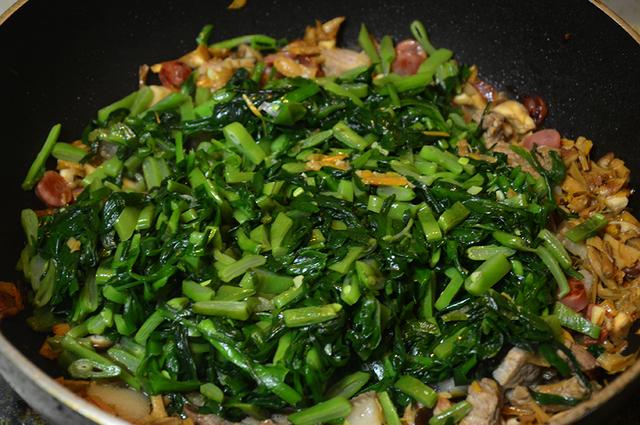 2、炒菜,油起锅,先放入豆角(豆角不太好软),然后依次放入韭菜和香菇,炒到韭菜那一堆草体积缩小。不用调味,5~8分钟就可以出锅啦。