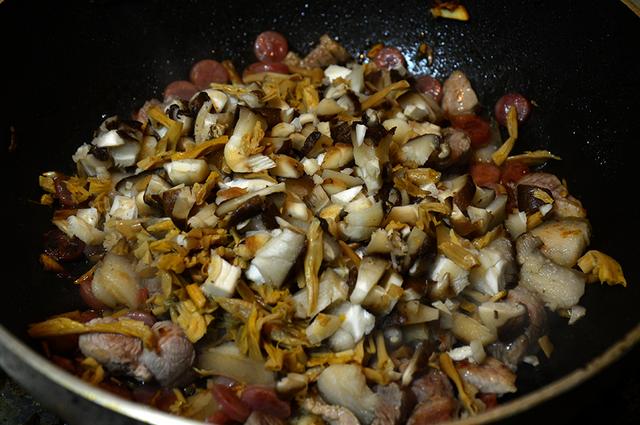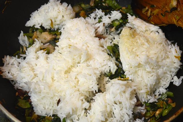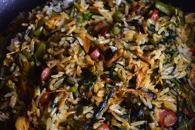4、菜和肉混合到一起,放入米饭,米饭是先煮好的。电饭煲的煮米饭,水末过米一点点就好了,这样煮出来的米饭不会很湿。这样炒饭起来,颗粒感也会更足一点。翻炒,尽量让米饭和菜、肉都合体到一起。
