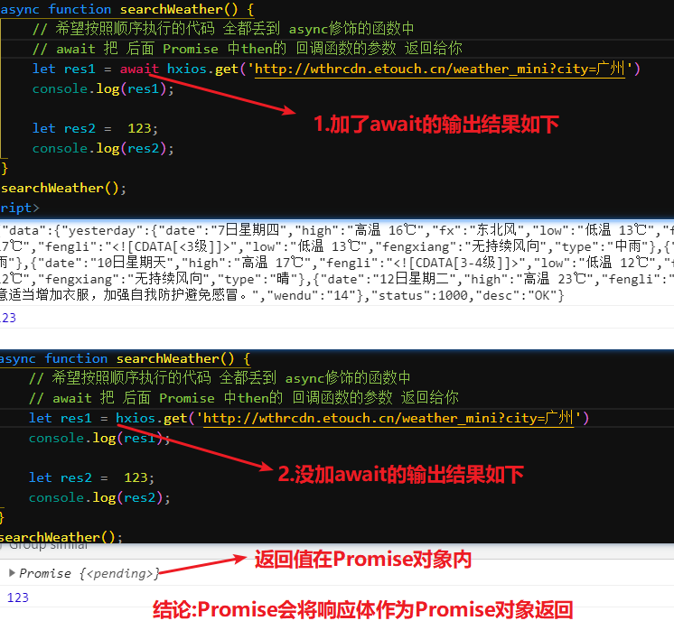 调用上述Promise封装的AJAX+async/await进行天气查询: